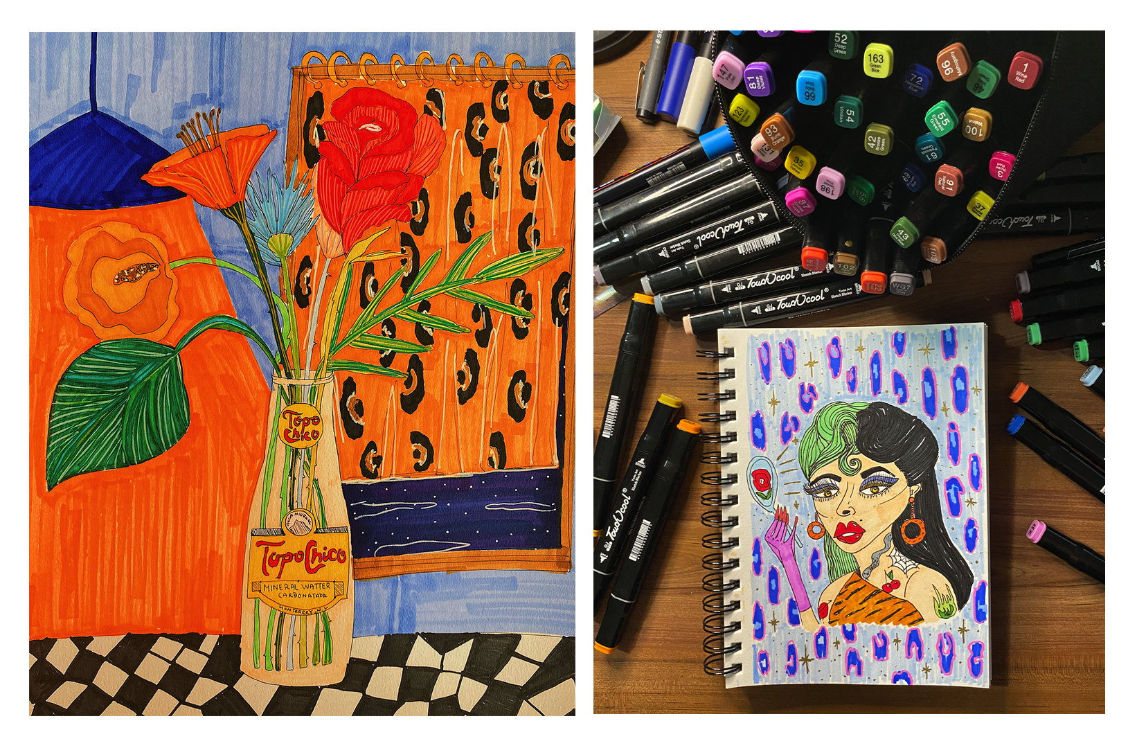 Cuando empezó la pandemia, por allá del 2020, creo que todos la recordamos; no hay necesidad de puntualizar la fecha, pero como quiera lo voy a hacer. No podíamos salir, era estar en nuestras casas 24/7 y yo tuve el privilegio de estar trabajando desde casa. Pero al pasar los días, semanas, meses, extrañaba fotografiar, aprender algo nuevo, y muchas veces pensé en desarrollar un proyecto personal fotográfico que tuviera relación con mi espacio, con mi hogar, pero simplemente no me inspiraba. En ese momento el dibujo fue un escape, fue un apoyo para calmar la ansiedad, pero también para expresarme por medio de la imagen. Me compré unos plumones, una libreta y dibujé, dibujé y dibujé; ponía música y me ponía a dibujar por 2 o 3 horas. Era como estar en un trance, en otra sintonía que me daba mucha paz. Y eso me hizo reconectar con mi yo adolescente, cuando dibujaba pero dejé de hacerlo porque “no era buena” y descubrí que el dibujo también es una forma en la que me gusta expresarme, como la fotografía. Por eso, cuando me preguntan a qué me dedico, decir que soy fotógrafa me gusta pero no me re suena del todo porque creo que me identifico más con “artista visual”, alguien que puede compartir cómo ve el mundo a través de “pintar con la luz” o “pintar con tinta” o hacer collage o crear una pieza. Las posibilidades son infinitas, somos y hacemos muchas cosas cuando somos artistas, y bueno, decir que “eres artista” frente al mundo es otro tema.